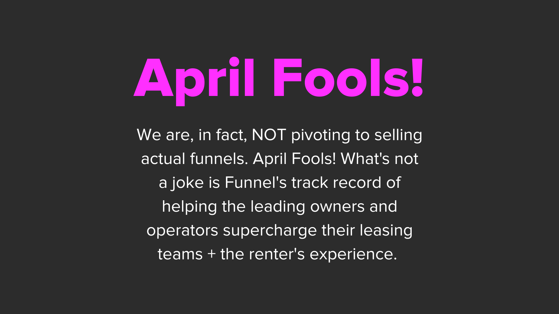 You may have picked up on it, but we are, in fact, NOT pivoting to selling actual funnels. April Fools! What's not a joke? Funnel's track record of helping the leading owners and operators supercharge their leasing teams + renter experience.